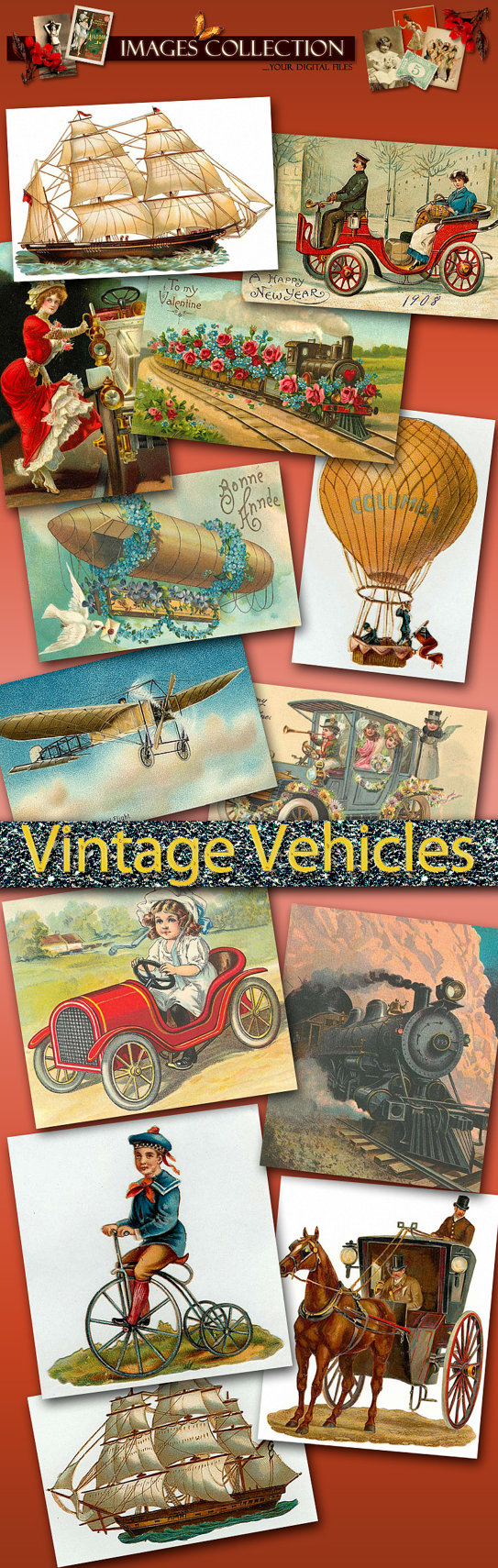Digital collection drawings of Vintage Vehicles transport ship bike train balloon air car labels decoupage ephemera lady romantic / C159In this page you will find: